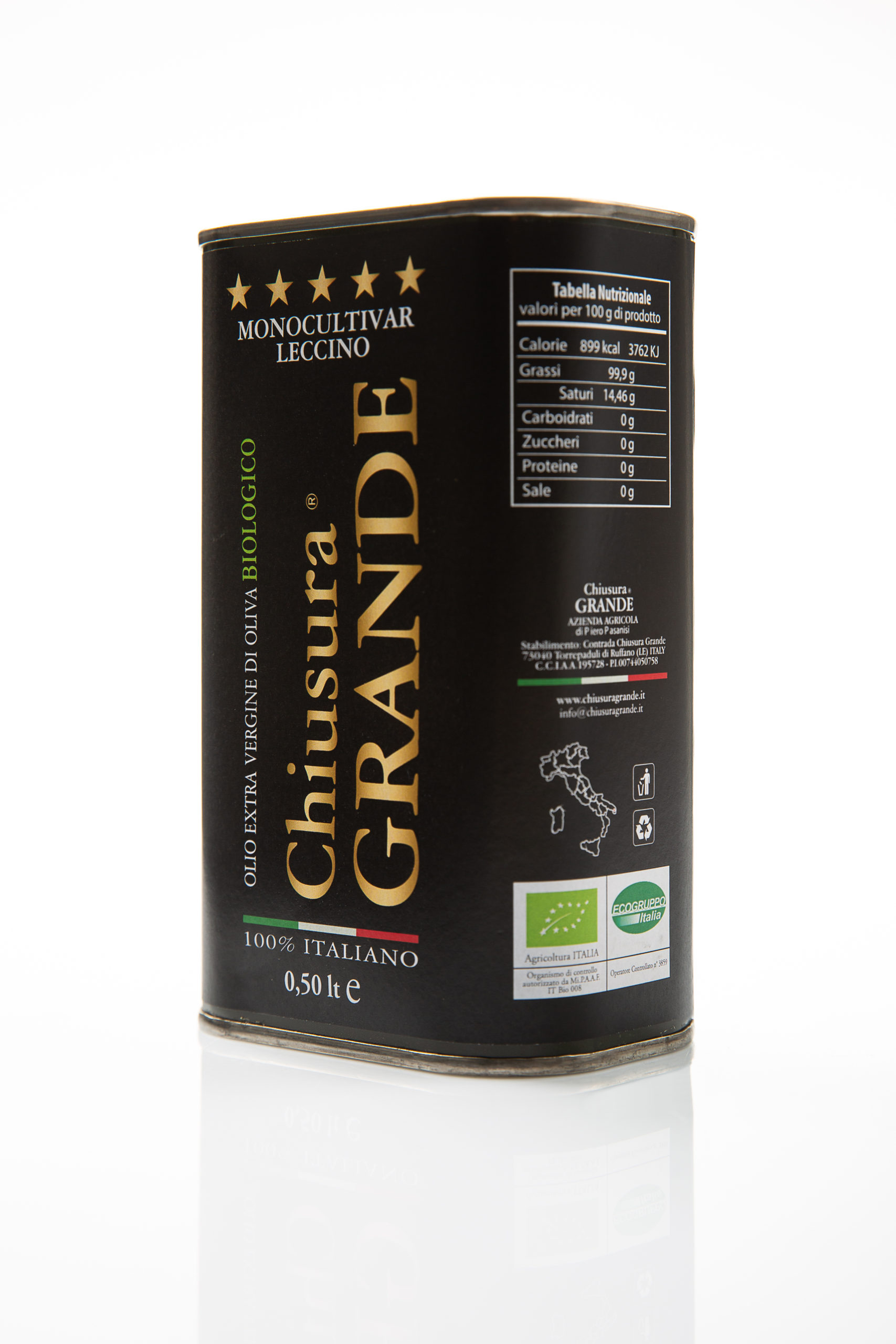 L’Olio Extravergine di Oliva Chiusura Grande Monocultivar Leccino, estratto a freddo, prodotto esclusivamente da oliva Leccino Biologica certificata, raccolta non ancora matura e molita in purezza, esprime il suo carattere tramite leggere note piacevolmente piccanti, proprie della cucina Salentina, che risulteranno gradite ai palati a cui piacciono i sapori esclusivi. In cucina, assume il ruolo di Ingrediente, pur rimanendo sempre il Condimento più comune e amato della tradizione culinaria mediterranea. Privilegia piatti dal sapore deciso, capaci di reggerne il confronto, quali minestre di legumi, minestroni, carni rosse alla brace e arrosti, ma risulta delicato e rifinitore soprattutto su piatti a base di pesce, ancor più quando insaporito e arricchito con erbe aromatiche.